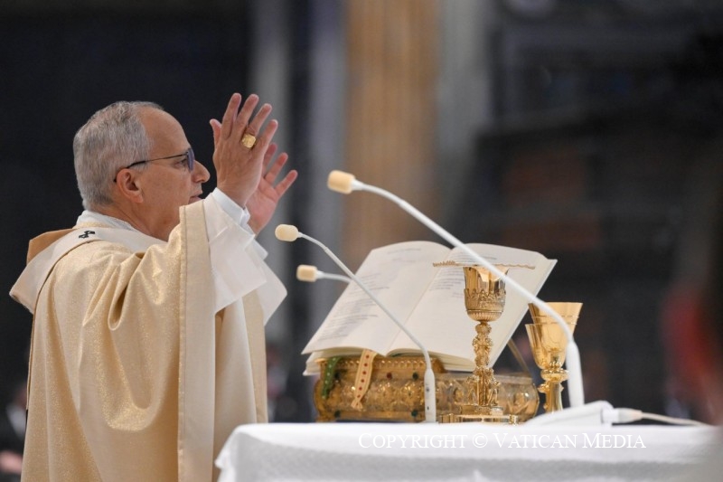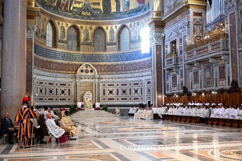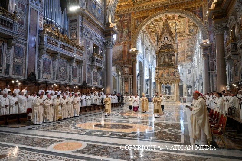 Cuối cùng, tôi muốn nhắc đến một khía cạnh thiết yếu trong sứ mạng của Nhà Thờ Chính Tòa: phụng vụ. Phụng vụ là “đỉnh cao mà mọi hoạt động của Giáo Hội hướng tới… nguồn mạch từ đó tuôn chảy mọi sức mạnh của Giáo Hội” (Hiến chế về Phụng vụ Thánh Sacrosanctum Concilium, 10). Trong phụng vụ, chúng ta thấy những chủ đề đã được nhắc đến trước đây: chúng ta được xây dựng nên như đền thờ của Thiên Chúa, là nơi Ngài ngự trong Thần Khí, và chúng ta nhận được sức mạnh để rao giảng Đức Kitô trong thế gian (x. ibid., 2). Vì thế, việc chăm sóc phụng vụ, đặc biệt tại Tòa Thánh Phêrô, phải được thực hiện sao cho trở thành gương mẫu cho toàn dân Chúa. Nó phải tuân thủ các quy chuẩn đã được thiết lập, chú ý đến những nhạy cảm khác nhau của những người tham dự, và giữ vững nguyên tắc thấm nhập văn hóa một cách khôn ngoan (x. ibid., 37-38). Đồng thời, phụng vụ phải trung thành với sự trang nghiêm điềm tĩnh đặc trưng của truyền thống Rôma, vốn mang lại nhiều ích lợi cho tâm hồn những người tham dự cách tích cực (x. ibid., 14). Mọi sự quan tâm cần được dành để đảm bảo rằng vẻ đẹp giản đơn của các nghi thức diễn tả giá trị của việc thờ phượng, góp phần vào sự trưởng thành hài hòa của toàn thân thể Chúa. Như Thánh Augustinô đã nói: “vẻ đẹp chẳng là gì khác ngoài tình yêu, và tình yêu là sự sống” (Discourse 365, 1). Sự thật này được thực hiện một cách nổi bật trong phụng vụ, và tôi hy vọng rằng những ai tiến đến bàn thờ tại Nhà Thờ Chính Tòa Rôma sẽ ra về với tràn đầy ân sủng mà Chúa mong muốn tuôn đổ trên thế gian (x. Ed 47,1-2.8-9.12).