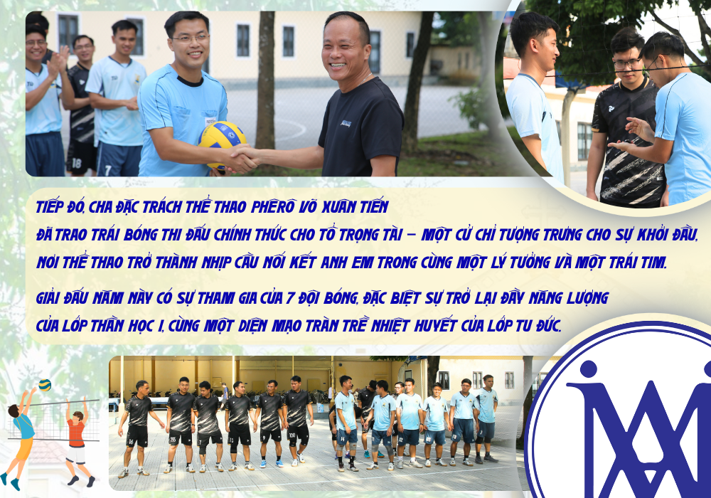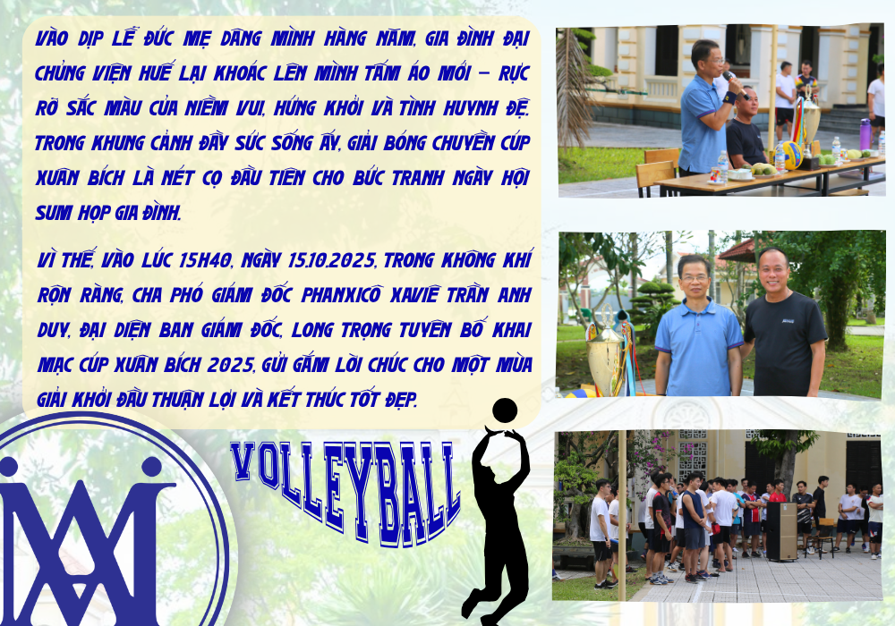 Giải bóng chuyền Cúp Xuân Bích 2025 được khai mạc vào ngày 15/10/2025, chuẩn bị mừng lễ Đức Mẹ Dâng Mình vào Đền Thánh, 21/11, bổn mạng Chủng viện và Hội Xuân Bích.