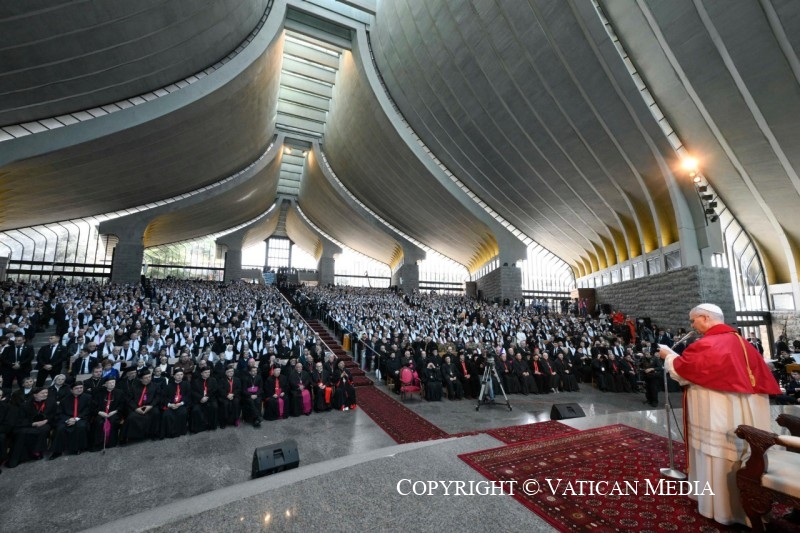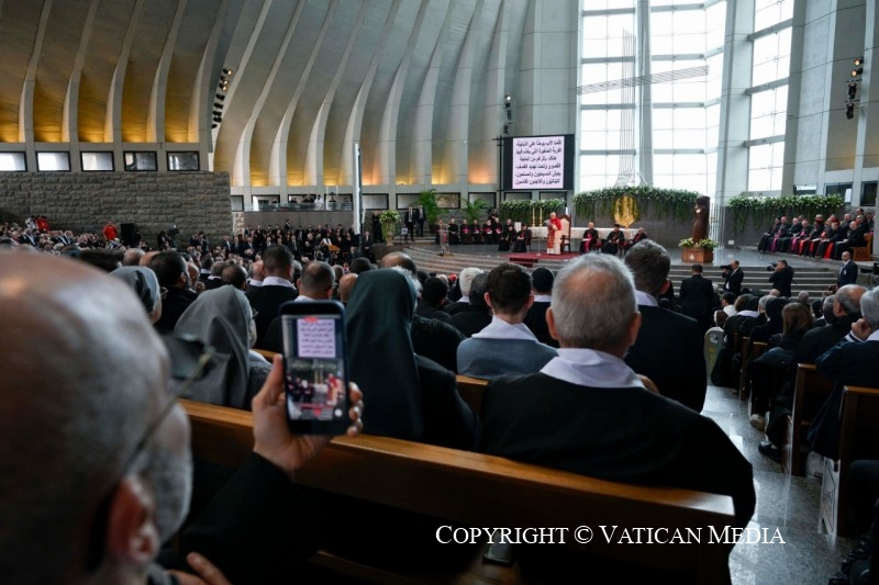 Được các giám mục và các đại diện của đời sống thánh hiến chào đón, Đức Thánh Cha mở đầu bài diễn văn bằng khẩu hiệu của chuyến tông du: “Phúc cho những người kiến tạo hòa bình”. Ngài nhắc lại lòng kính trọng mà Thánh Gioan Phaolô II dành cho Li-Băng, một quốc gia mà ngài gọi là “có trách nhiệm với niềm hy vọng”, và ngài thúc giục tạo ra “bầu khí huynh đệ” trong bối cảnh thường xuyên bị đánh dấu bởi những thử thách.