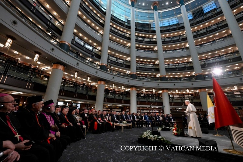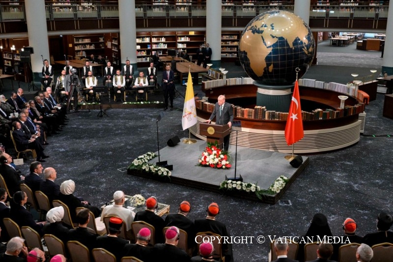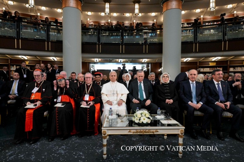 Sau khi viếng thăm Lăng Atatürk và được tiếp đón tại Dinh Tổng thống ở Ankara để hội kiến riêng với Tổng thống Recep Tayyip Erdoğan, Đức Lêô XIV đã đến Thư viện Quốc gia Thổ Nhĩ Kỳ, nằm trong khu phức hợp tổng thống, để gặp gỡ các nhà chức trách, đại diện của xã hội dân sự và đoàn ngoại giao, và đọc bài phát biểu đầu tiên trong chuyến tông du của mình. Trước đó, Tổng thống Thổ Nhĩ Kỳ đã có bài phát biểu, nhấn mạnh tầm quan trọng của chuyến thăm trong bối cảnh quan trọng này, nơi những thách thức và vấn đề quốc tế ngày càng gia tăng, từ châu Á đến châu Mỹ. Ông giải thích rằng căng thẳng, xung đột, khủng hoảng kinh tế và biến đổi khí hậu đều là những yếu tố góp phần dẫn đến làn sóng di cư từ những vùng đất này.