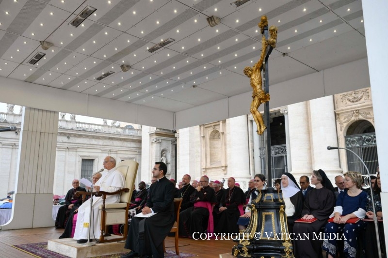 Hôm nay, một lần nữa, chúng ta chiêm ngắm mầu nhiệm Thứ Bảy Tuần Thánh. Đây là ngày của Mầu Nhiệm Vượt Qua, trong đó mọi sự dường như bất động và im lặng, nhưng thực tế một hành động cứu độ vô hình đang được thực hiện: Đức Kitô xuống cõi âm ty để mang tin mừng Phục Sinh đến cho tất cả những ai đang còn trong bóng tối và bóng sự chết.