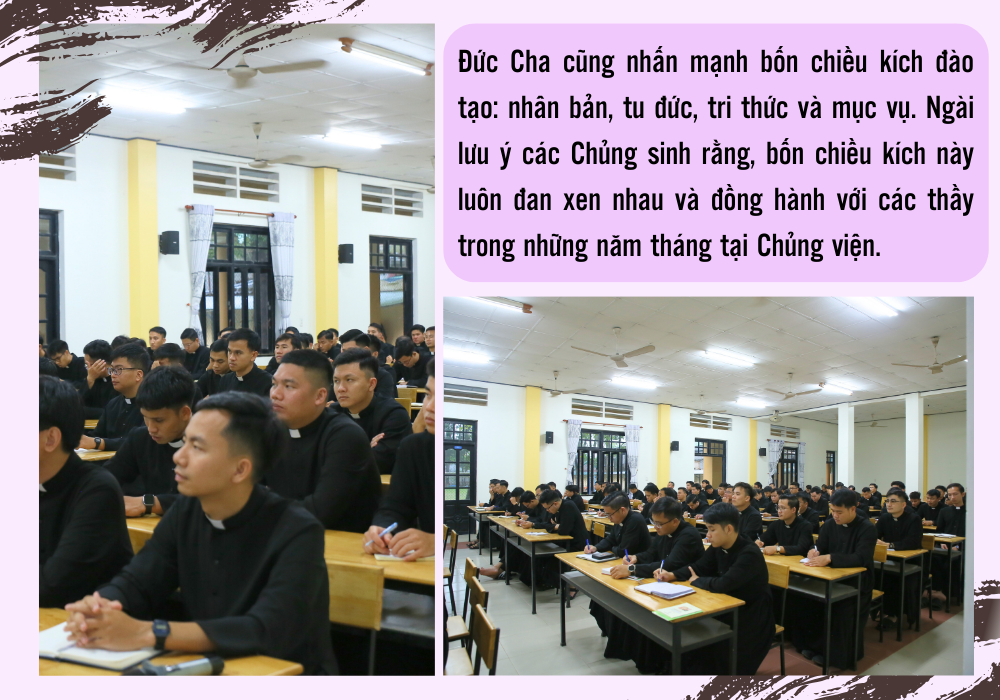 Đức Cha Aloisiô cũng nhấn mạnh bốn chiều kích đào tạo: nhân bản, tu đức, tri thức và mục vụ. Ngài lưu ý các Chủng sinh rằng, bốn chiều kích này luôn đan xen nhau và đồng hành với các thầy trong những năm tháng tại Chủng viện.