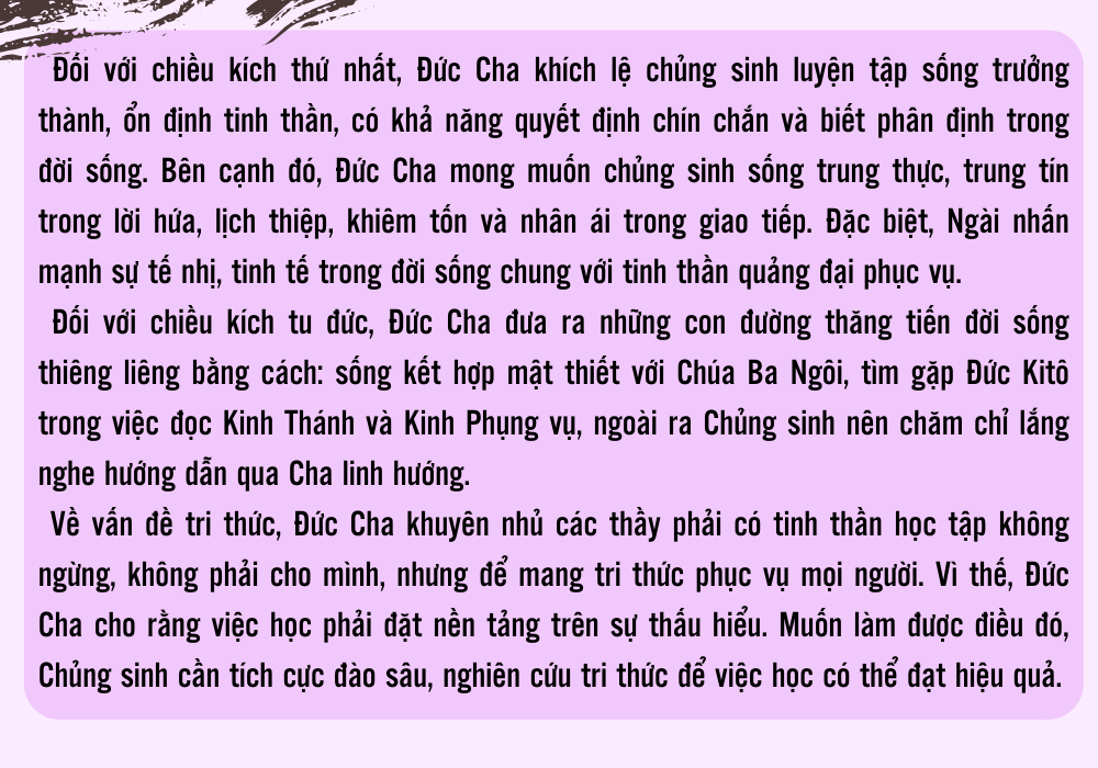 Về vấn đề tri thức, Đức Cha khuyên nhủ các thầy phải có tinh thần học tập không ngừng, không phải cho mình, nhưng để mang tri thức phục vụ mọi người. Vì thế, Đức Cha cho rằng việc học phải đặt nền tảng trên sự thấu hiểu. Muốn làm được điều đó, Chủng sinh cần tích cực đào sâu, nghiên cứu tri thức để việc học có thể đạt hiệu quả.