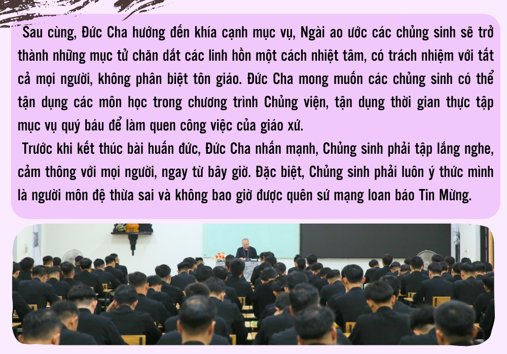 Trước khi kết thúc bài huấn đức, Đức Cha nhấn mạnh rằng Chủng sinh phải tập lắng nghe, cảm thông với mọi người, ngay từ bây giờ. Đặc biệt, Chủng sinh phải luôn ý thức mình là người môn đệ thừa sai và không bao giờ được quên sứ mạng loan báo Tin Mừng.