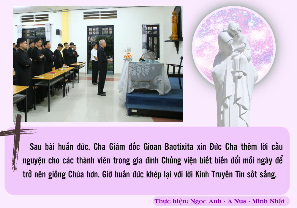 Sau bài huấn đức, Cha Giám đốc. xin Đức Cha thêm lời cầu nguyện cho các thành viên trong gia đình Chủng viện biết biến đổi mỗi ngày để trở nên giống Chúa hơn. Giờ huấn đức khép lại với lời Kinh Truyền Tin sốt sắng.