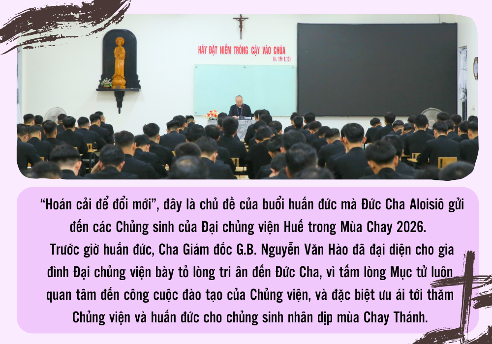“Hoán cải để đổi mới”, đây là chủ đề của buổi huấn đức mà Đức Cha Aloisiô gửi đến các Chủng sinh của Đại chủng viện Huế trong Mùa Chay 2026.