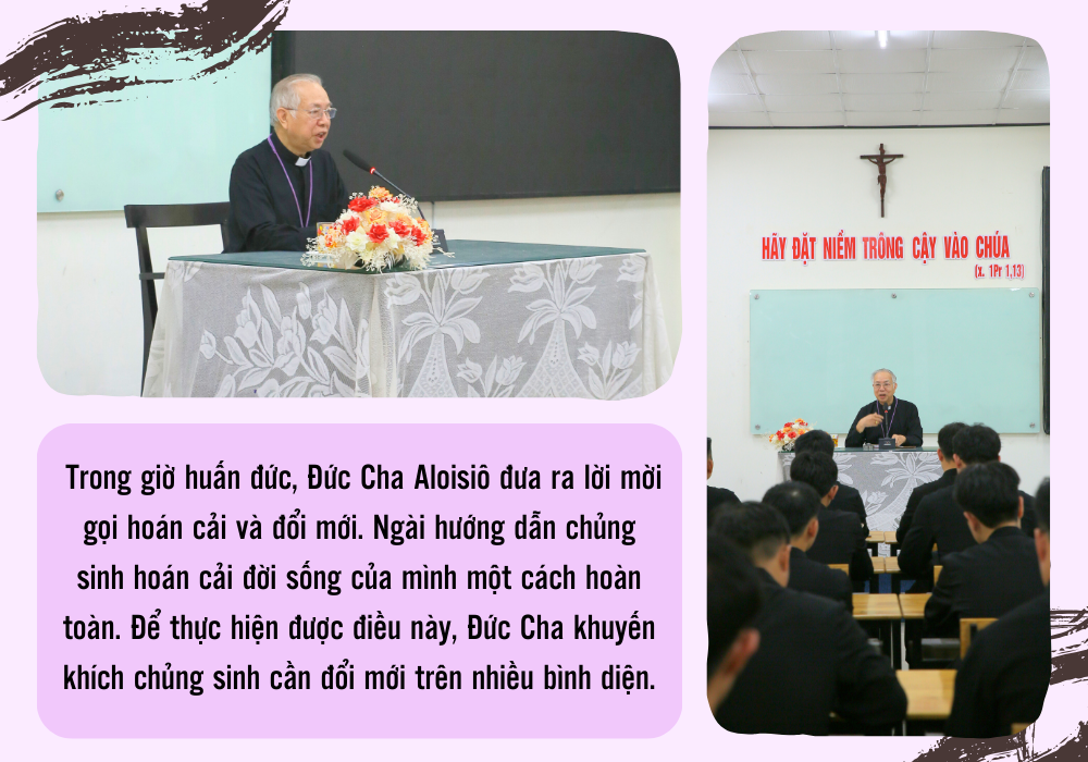 Trong giờ huấn đức, Đức Cha Aloisiô đưa ra lời mời gọi hoán cải và đổi mới. Ngài hướng dẫn chủng sinh hoán cải đời sống của mình một cách hoàn toàn. Để thực hiện được điều này, Đức Cha khuyến khích chủng sinh cần đổi mới trên nhiều bình diện.
