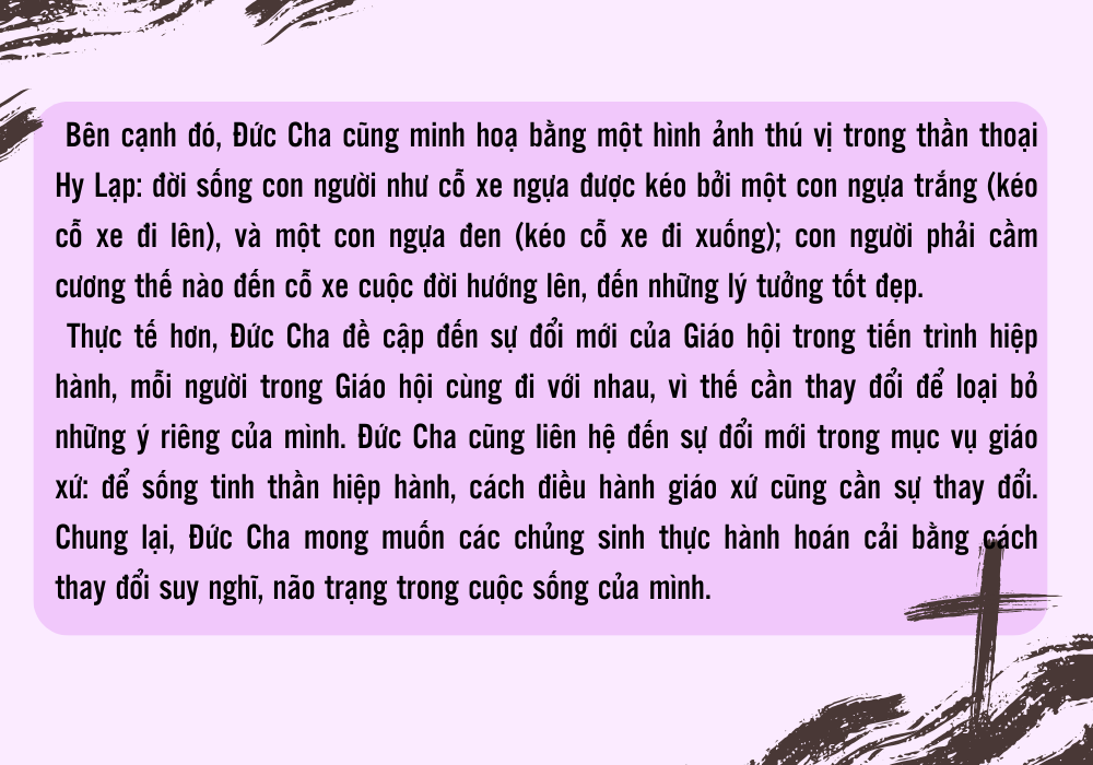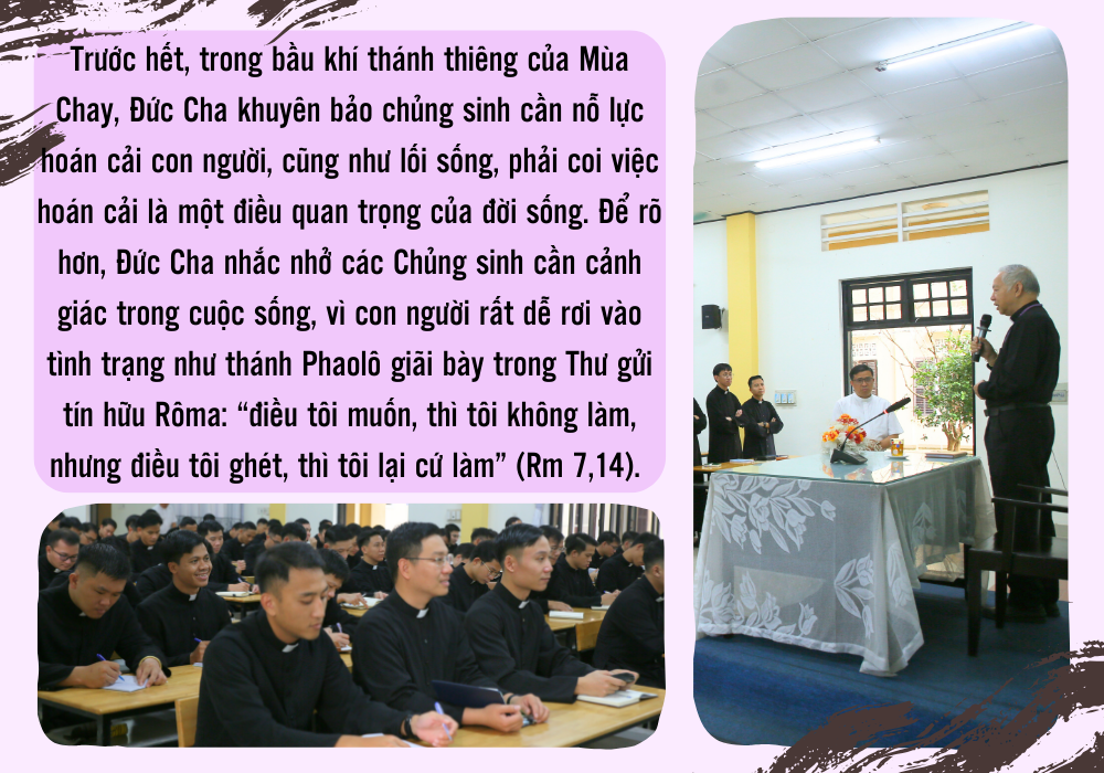 Trước hết, trong bầu khí thánh thiêng của Mùa Chay, Đức Cha khuyên bảo chủng sinh cần nỗ lực hoán cải con người, cũng như lối sống, phải coi việc hoán cải là một điều quan trọng của đời sống. Để rõ hơn, Đức Cha nhắc nhở các Chủng sinh cần cảnh giác trong cuộc sống, vì con người rất dễ rơi vào tình trạng như thánh Phaolô giãi bày trong Thư gửi tín hữu Rôma: “điều tôi muốn, thì tôi không làm, nhưng điều tôi ghét, thì tôi lại cứ làm” (Rm 7,14).