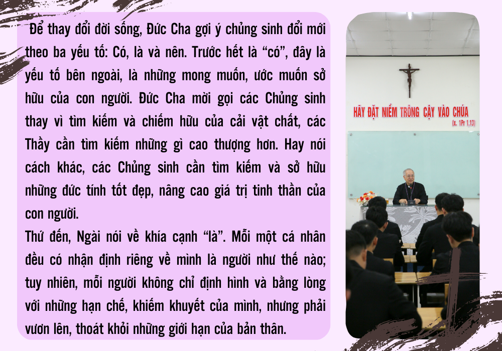 Để thay đổi đời sống, Đức Cha gợi ý chủng sinh đổi mới theo ba yếu tố: có, là và nên. Trước hết là “có”. Đây là yếu tố bên ngoài, là những mong muốn, ước muốn sở hữu của con người. Đức Cha mời gọi các Chủng sinh, thay vì tìm kiếm và chiếm hữu của cải vật chất, hãy tìm kiếm những gì cao thượng hơn. Hay nói cách khác, các Chủng sinh cần tìm kiếm và sở hữu những đức tính tốt đẹp, nâng cao giá trị tinh thần của con người.