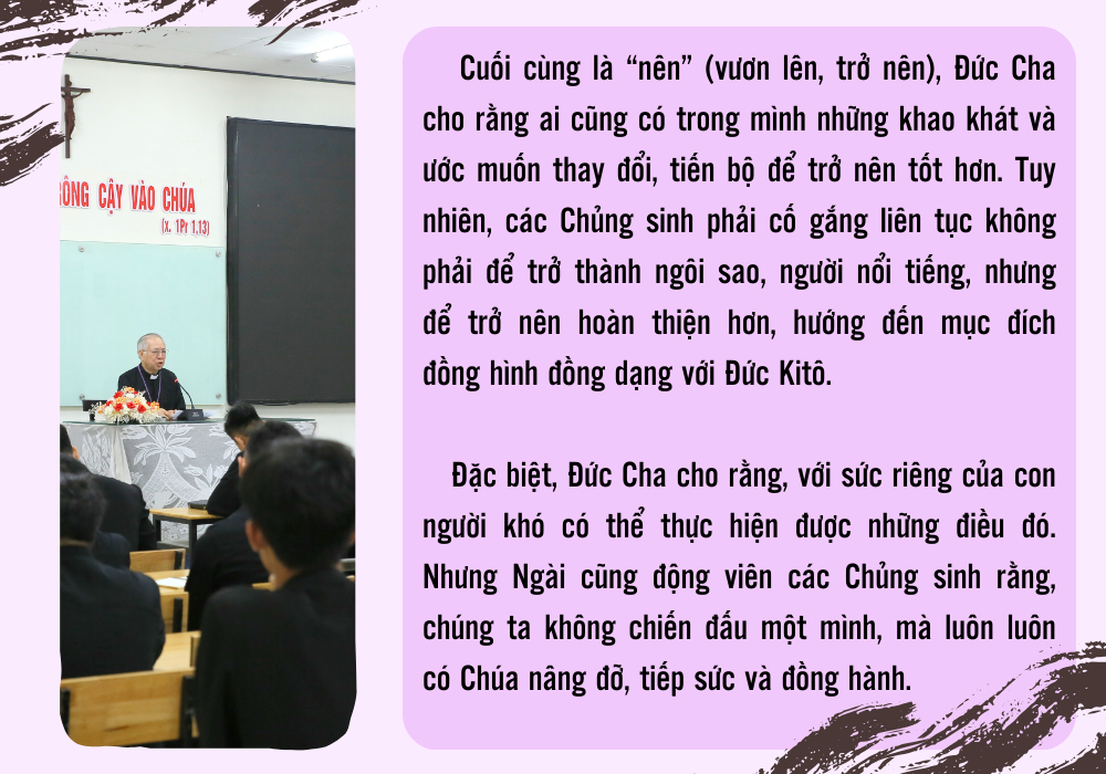 Cuối cùng là “nên” (vươn lên, trở nên). Vị Chủ chăn Giáo phận Kontum cho rằng ai cũng có trong mình những khao khát và ước muốn thay đổi, tiến bộ để trở nên tốt hơn. Tuy nhiên, các Chủng sinh phải cố gắng liên tục không phải để trở thành ngôi sao, người nổi tiếng, nhưng để trở nên hoàn thiện hơn, hướng đến mục đích đồng hình đồng dạng với Đức Kitô.