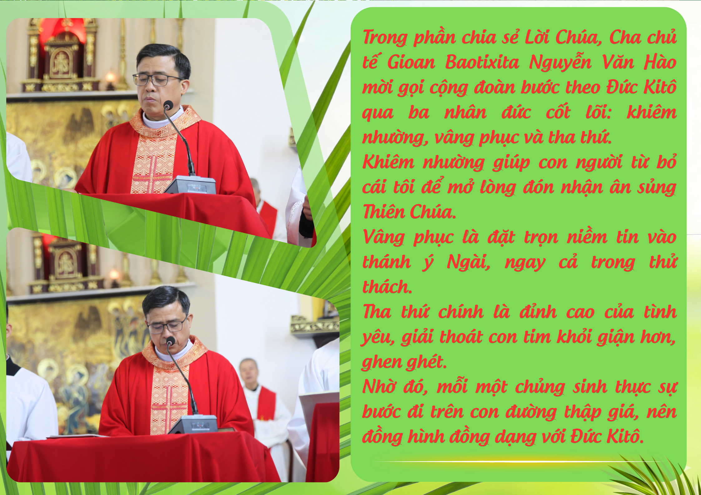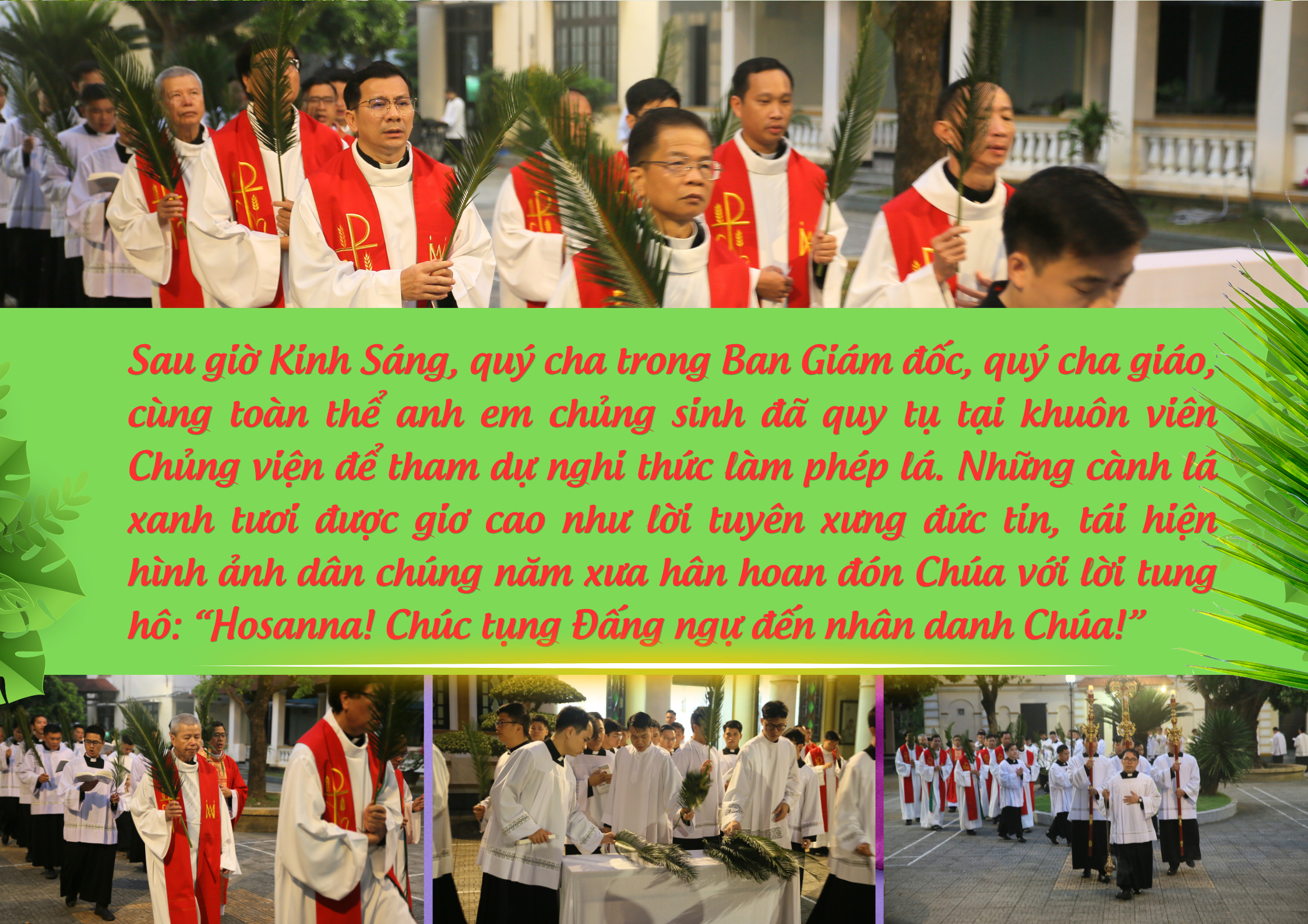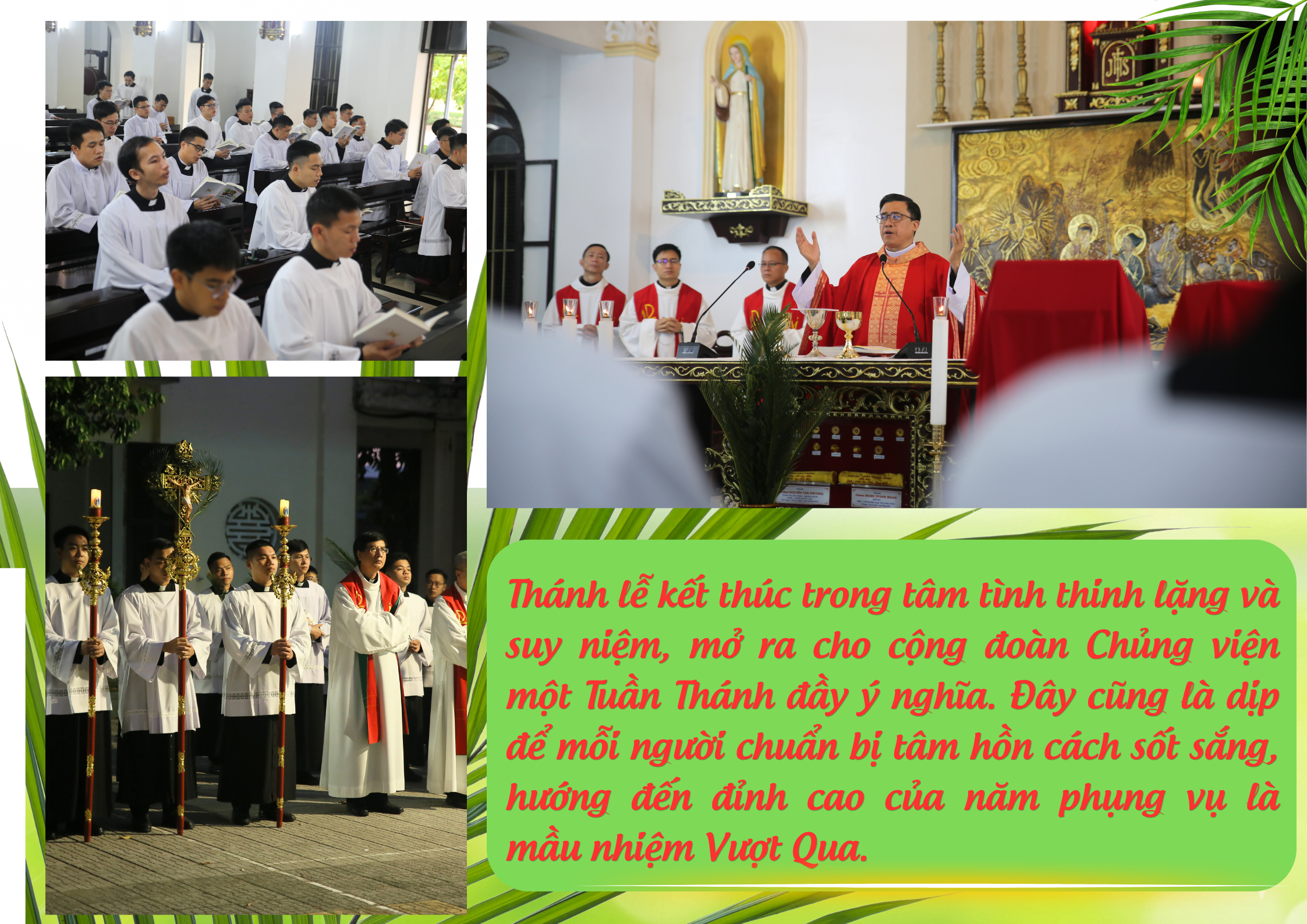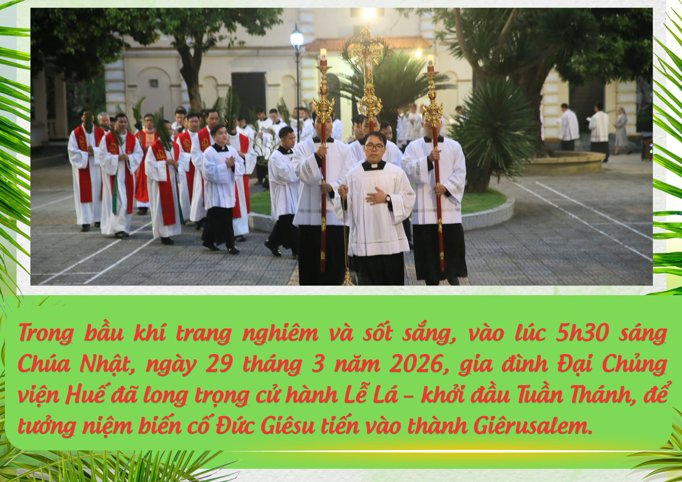 Trong bầu khí trang nghiêm và sốt sắng, vào lúc 5h30 sáng Chúa Nhật, ngày 29 tháng 3 năm 2026, gia đình Đại Chủng viện Huế đã long trọng cử hành Lễ Lá – khởi đầu Tuần Thánh, để tưởng niệm biến cố Đức Giêsu tiến vào thành Giêrusalem.