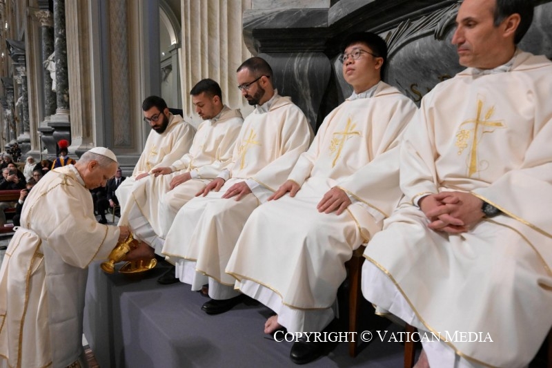 Sau đó, Đức Thánh Cha đã rửa và hôn chân mười hai linh mục thuộc giáo phận của mình, mười một trong số đó đã được Đức Phanxicô truyền chức một năm trước đó. Vị Giáo hoàng người Argentina có thói quen cử hành thánh lễ này tại các nhà tù, như ngài đã từng làm khi còn là Tổng Giám mục Buenos Aires, và rửa chân cho các tù nhân.