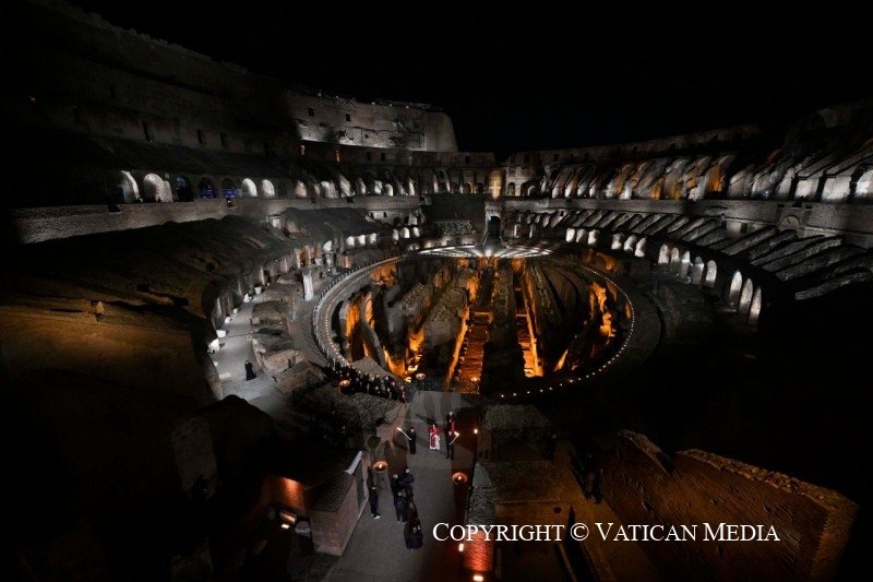 Được tháp tùng bởi chưởng nghi phụng vụ của Tòa Thánh và Đức Hồng y – đại diện Rôma, Đức Lêô XIV đã long trọng đi bộ qua mười bốn chặng Đàng Thánh Giá, dừng lại ở mỗi chặng để suy niệm những đoạn trích từ Tin Mừng và các bản văn của thánh Phanxicô Assisi, và dâng lời cầu nguyện, được 30.000 người hành hương tụ tập quanh Colisée cùng nhau lặp lại, tay cầm nến.